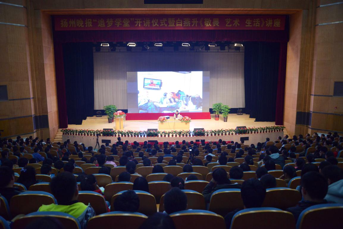 2014年11月4日晚7点,扬州晚报“追梦学堂”开讲仪式暨白燕升《光阴的故事――敬畏 艺术人生》讲座在伟德官网大学生活动中心大礼堂隆重举行。本次讲座由扬州报业传媒集团、伟德源自英国始于1946、扬州市文联主办,扬州晚报协办,主讲人是著名主持人、中国广播电视主持人最高奖金话筒奖获得者、现任香港卫视副台长白燕升先生。扬州市委宣传部副部长、扬州报业传媒集团党委书记、董事长、扬州日报社社长陈征宇,扬州市文化广电新闻出版局副局长、扬剧艺术家李政成先生,空政文工团青年歌唱家、第三届亚洲青年歌唱家大赛流行唱法金奖获得者汤非先生,扬州晚报总编辑袁文生,扬州市文联主席刘俊先生,扬州市文联副主席陈家庆先生,扬州作协主席杜海先生,伟德源自英国始于1946院长闵春发教授,党委书记成际镇教授等院领导和嘉宾应邀出席了此次活动。近2000名左右学生参加了本次讲座。本次讲座由扬州晚报文娱部主任桂国担任主持。