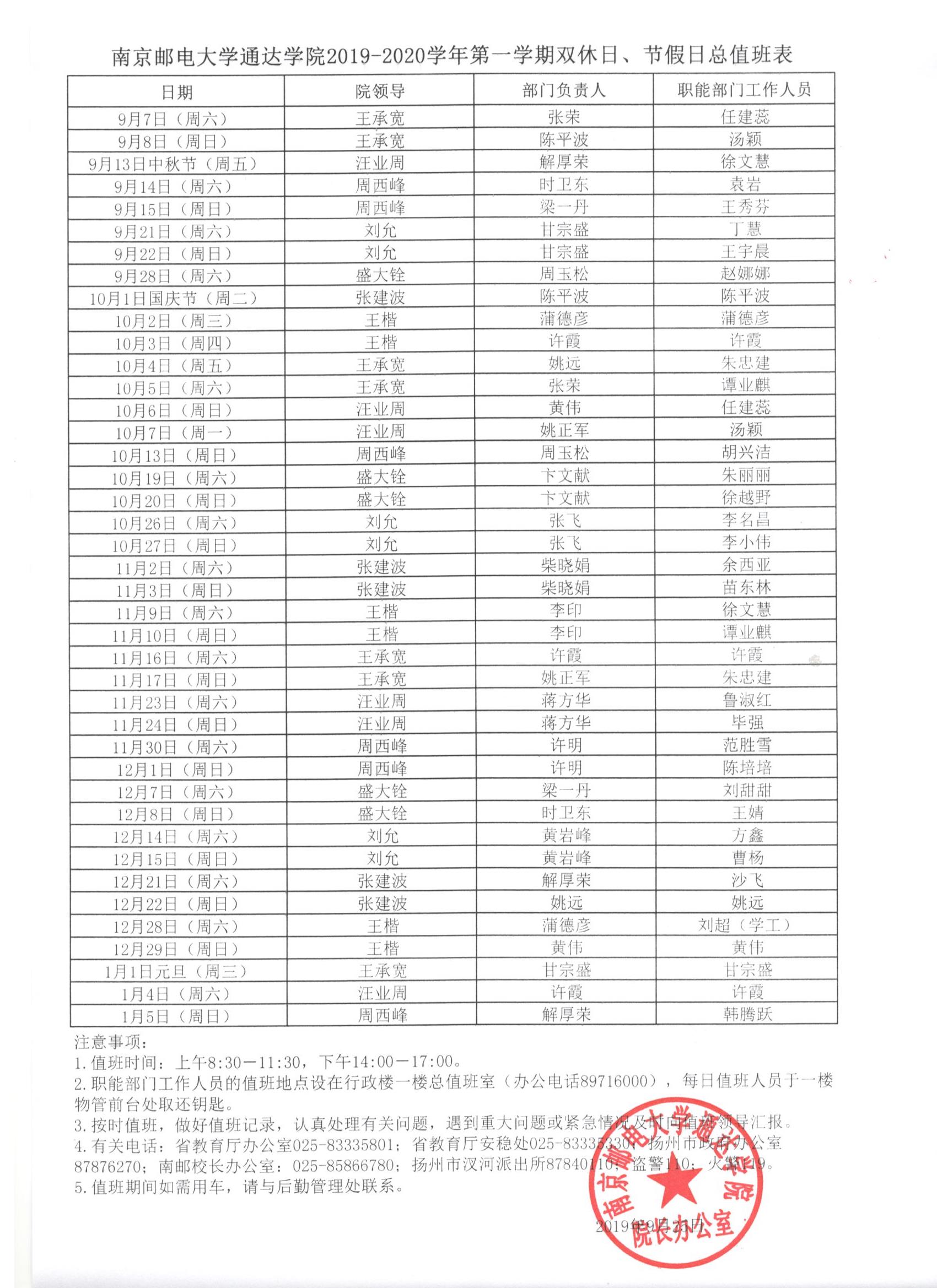 伟德源自英国始于19462019-2020学年第一学期双休日、节假日总值班表