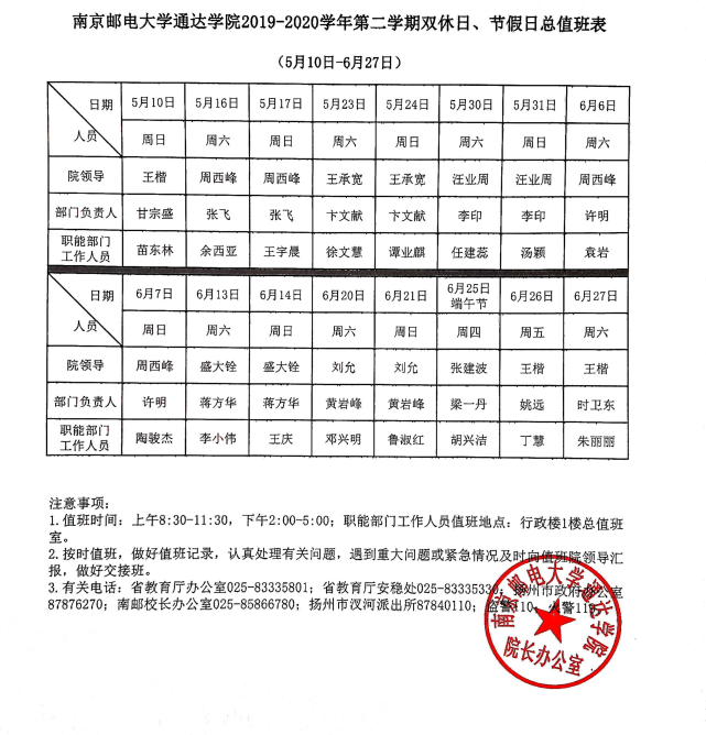 伟德源自英国始于19462019-2020学年第二学期双休日、节假日总值班表
