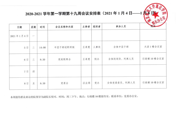 2020-2021学年第一学期第十九周会议安排表