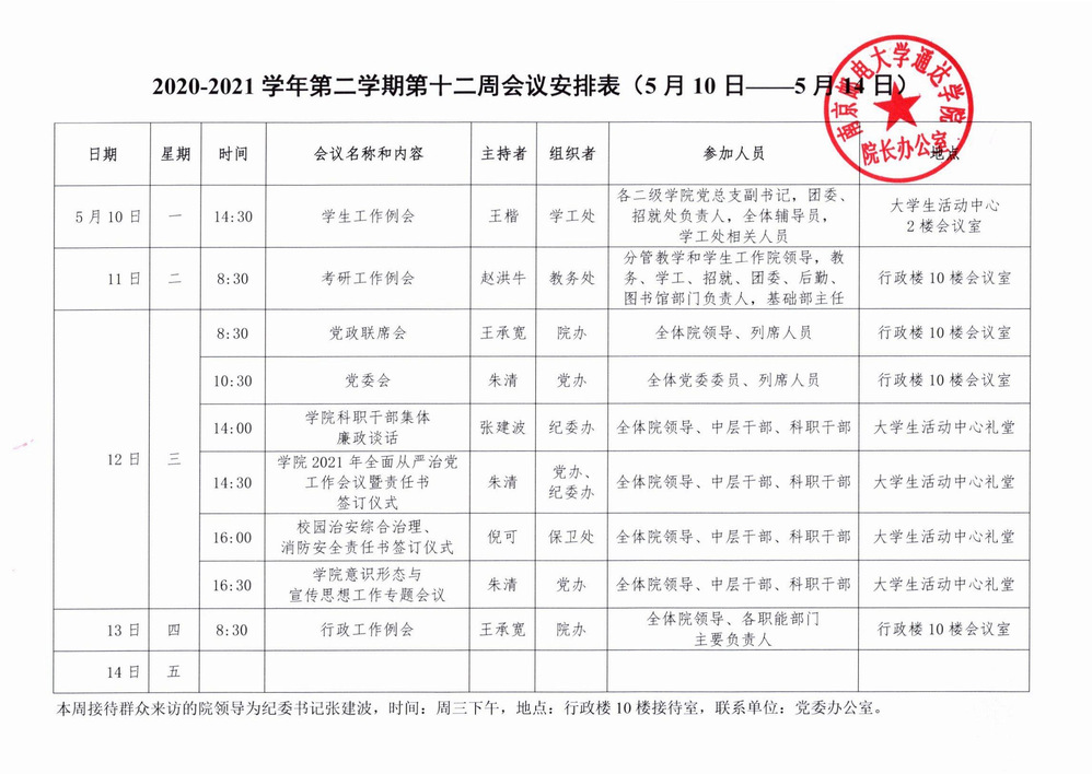 2020-2021学年第二学期第十二周会议安排表