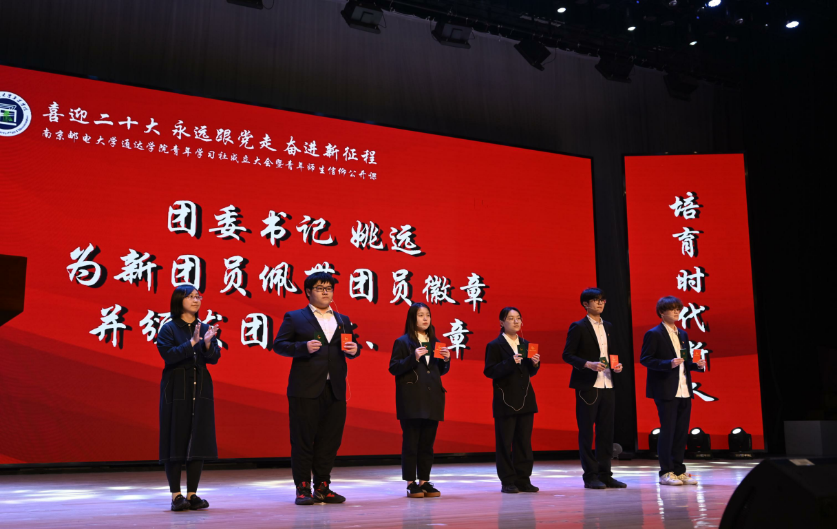 团委书记姚远为新团员佩带团员徽章并颁发团员证、团章