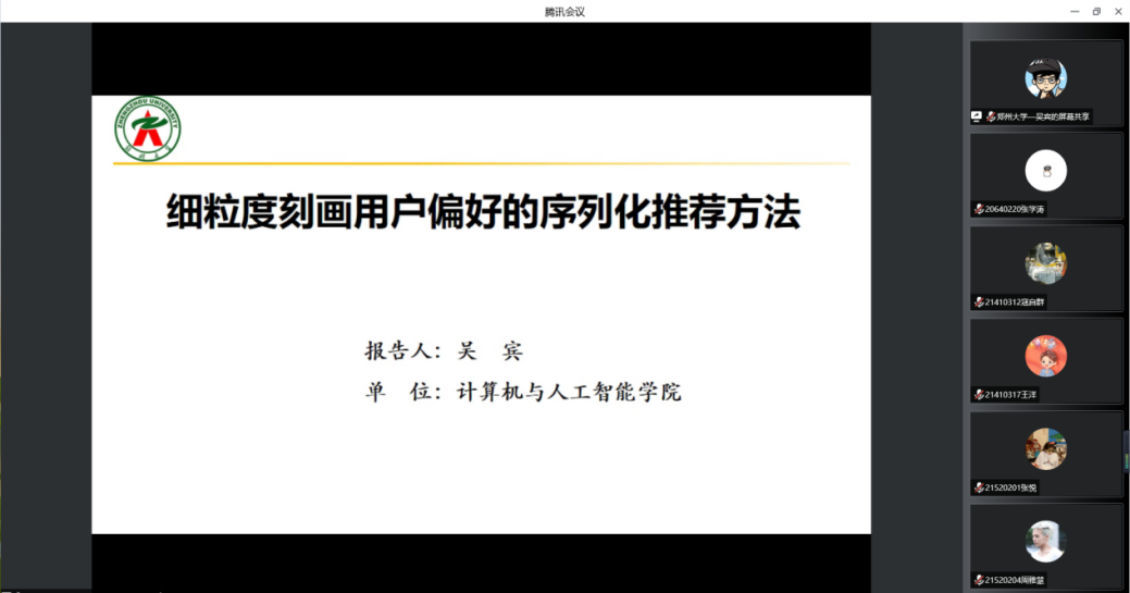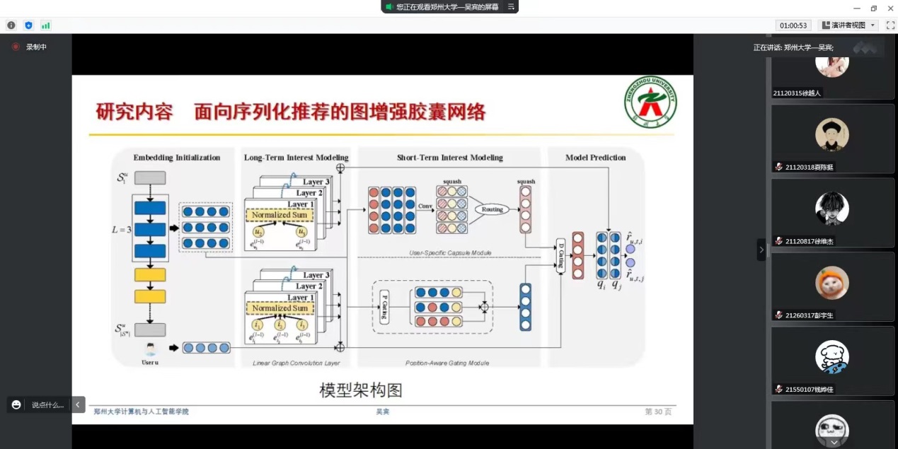 9月28日,由伟德官网教务处主办,计算机工程学院承办的“细粒度刻画用户偏好的序列化推荐系统”为主题的学术讲座在线上举行,本次讲座邀请郑州大学副研究员吴宾博士担任主讲。