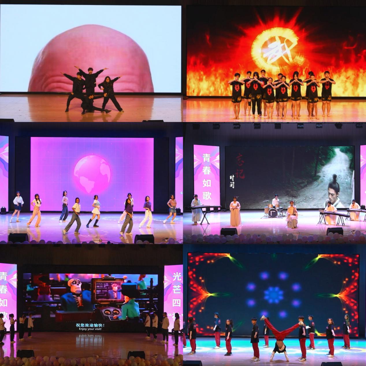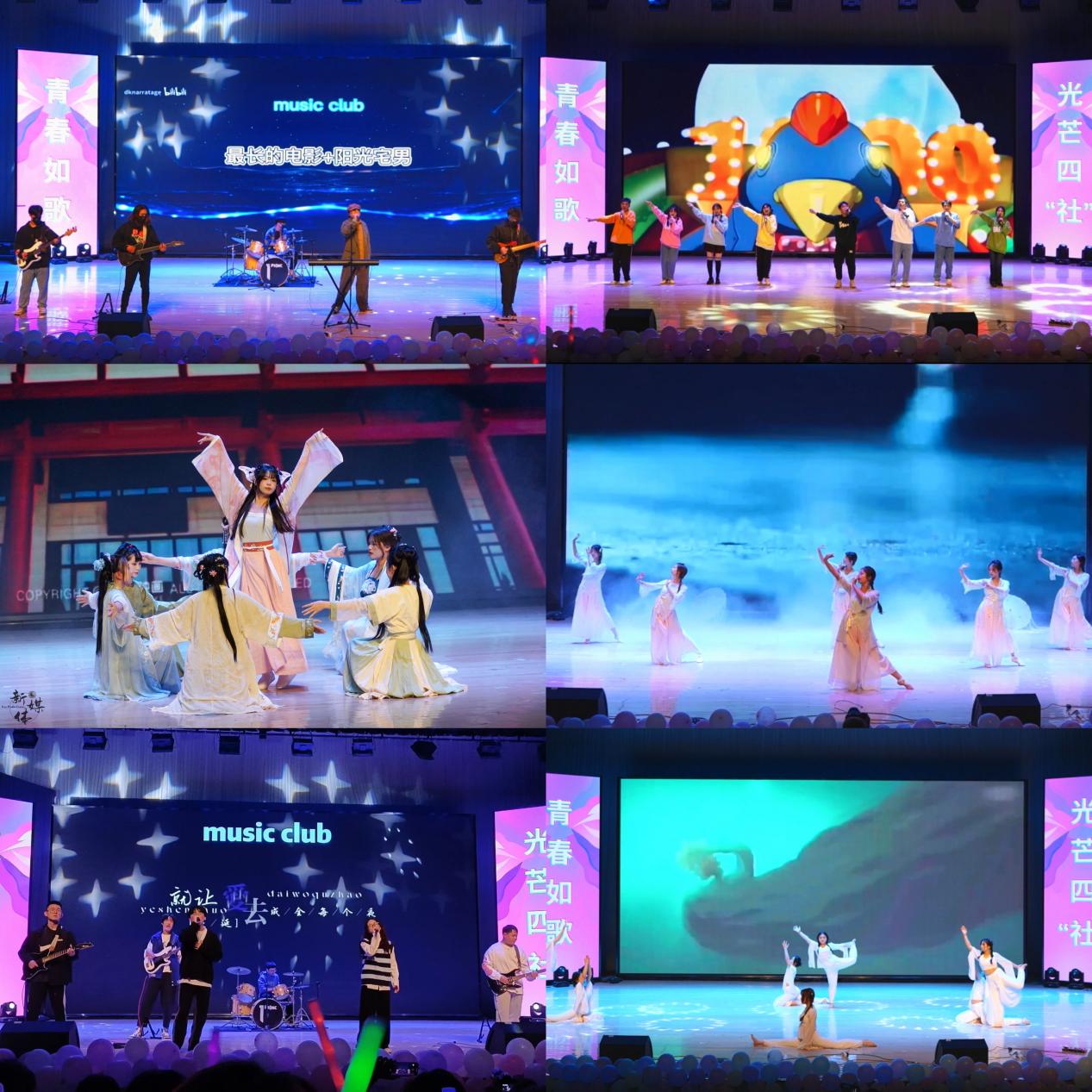 晚会在Music club带来的暖场音乐《最长的电影》、《阳光男孩》中拉开了帷幕;起灵舞蹈社以一支古风爵士《红马》,带观众走进古典舞蹈世界;大艺团声乐团的《童年歌曲串烧》感染现场观众追忆往昔、找回童真;秀慧瑜伽社以《大鱼》为曲,瑜伽为“舞”,展示舞之美,意之远;Music club返场带来的歌曲《带我去找夜生活》、《给你一瓶魔法药水》以青春的曲调带动全场;华卿国学社的《春日游》带观众感受中华传统汉服文化的魅力;大艺团演艺团的情景剧《发量保卫战》让观众感受到诙谐幽默的语言魅力;威扬散打社的《战和威扬》将晚会现场的气氛推向高潮;大艺团舞团的《舞蹈串烧》展现当代大学生的青春活力;大艺团器乐团的《忘记时间》将民乐与打击乐完美结合,展现器乐合奏的独特韵味;英语协会带来的《英语配音》摘选经典电影片段,以声传达感情。4+1街舞社以《Four plus one》以动感的舞姿展现青春愉悦的节拍;社联带来的《别怕变老》激情澎湃,感染全场,为整场晚会画上了圆满句号。