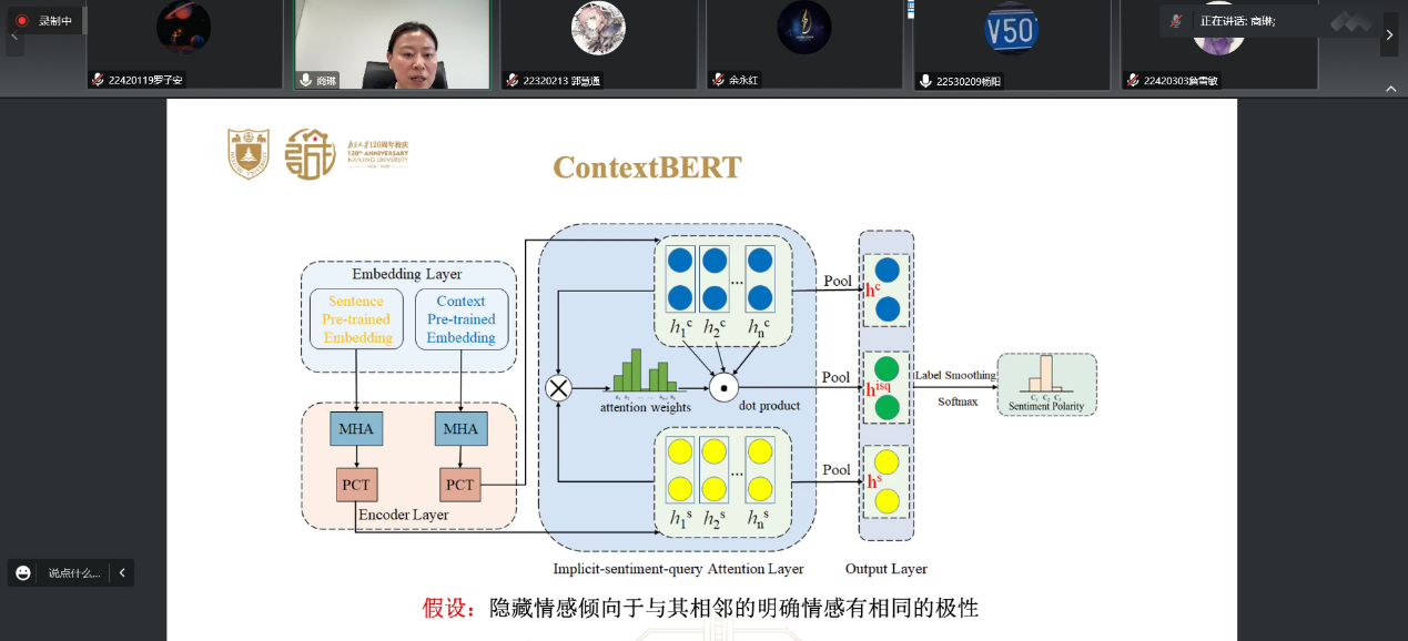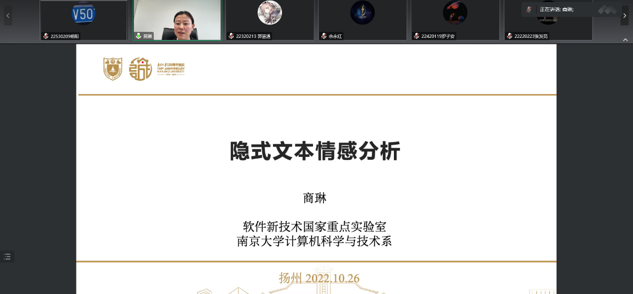 报告中,商琳以社交网络中的观点发现为引入,介绍了文本情感分析的应用价值、任务范式和技术变迁。针对隐式文本情感分析任务,阐释了任务数据集的构建方法和Aspect级隐式文本情感分析技术,并分享了其研究团队在该领域的最新工作和延伸方向。报告最后,商琳与同学们在多个问题上进行了友好互动,并给予了指导和建议。整个报告视野宏阔、内容新颖。商教授的讲解深入浅出、引人入胜,受到与会师生的欢迎与点赞。