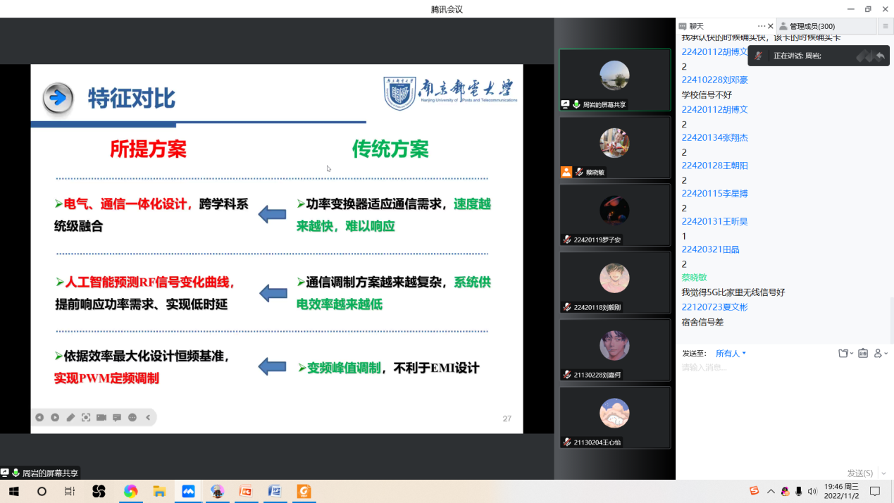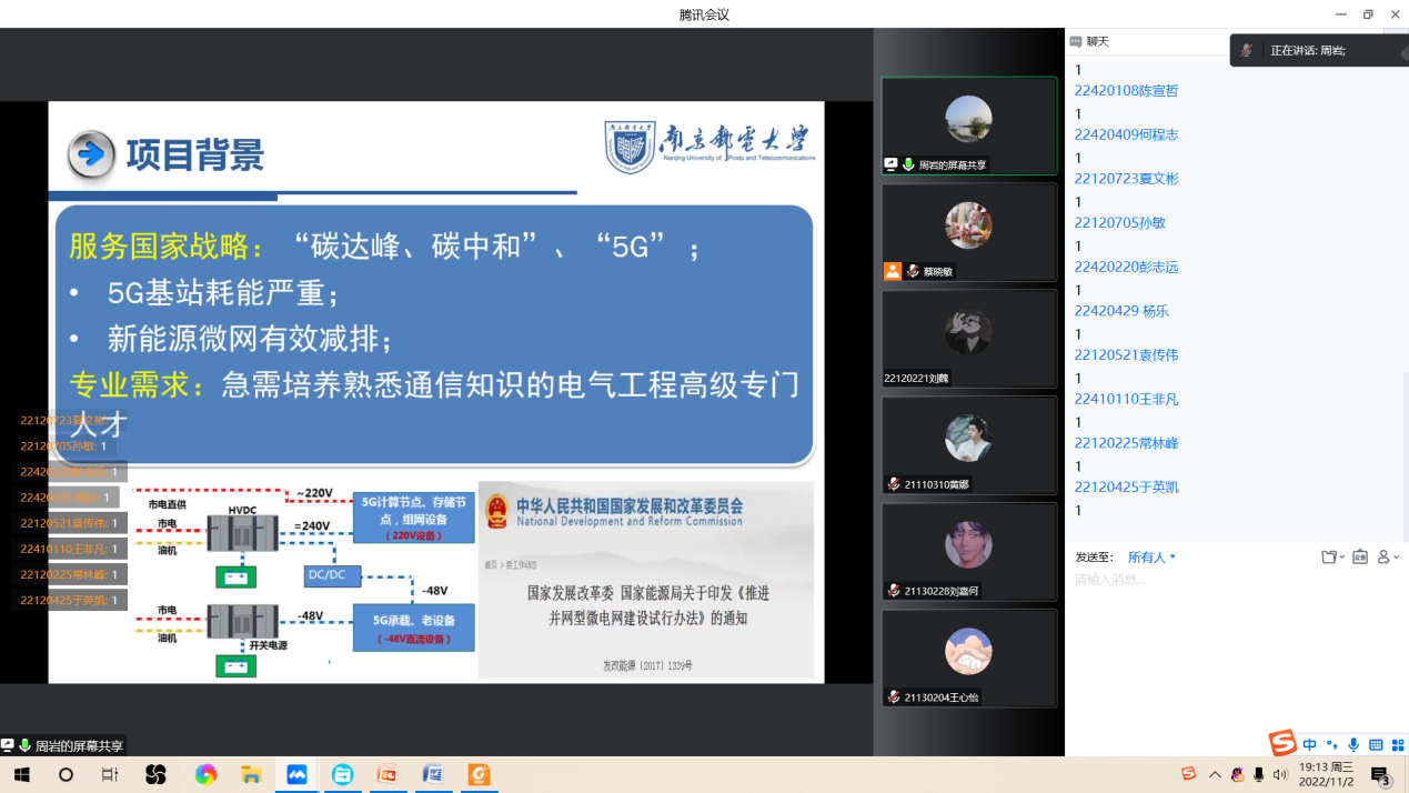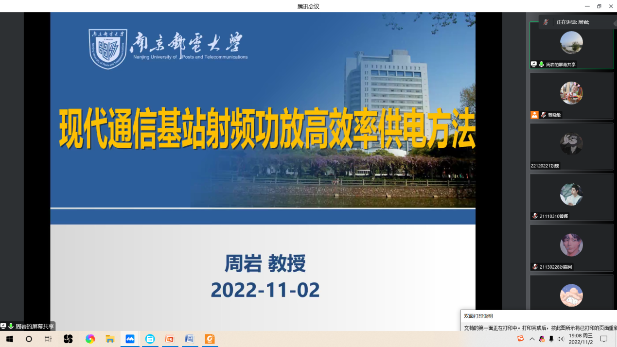 报告中,周岩教授从现代通信基站射频功放高效率供电方法简介、现有问题、创新思路、发展愿景四个方面展开介绍。从碳达峰、碳中和、5G等热门的概念词出发,引出5G基站能耗大,需要有效减排的背景,并提出人工智能的解决方案。针对远期规划,分享了太阳能、风能、储能单元等新能源供电研究的方向。