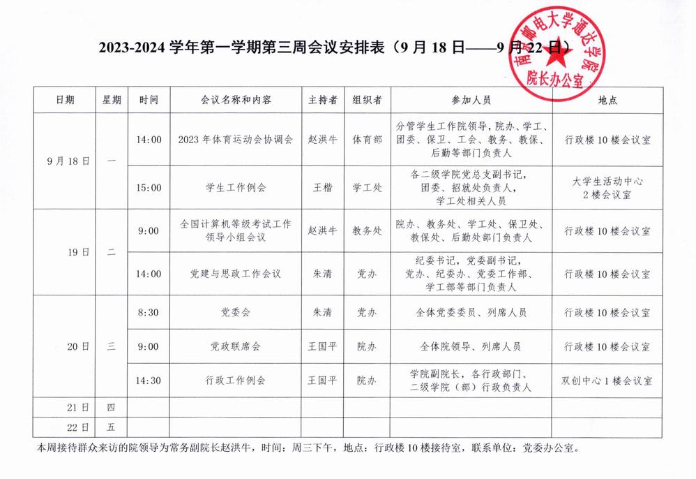 2023-2024学年第一学期第三周会议安排表