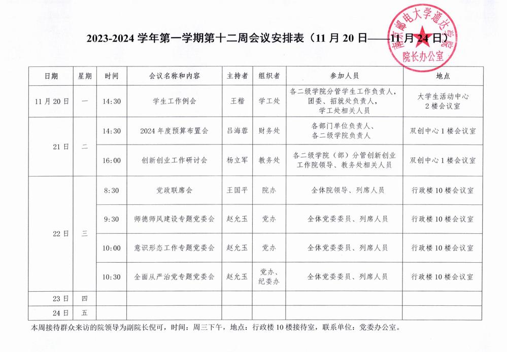 2023-2024学年第一学期第十二周会议安排表