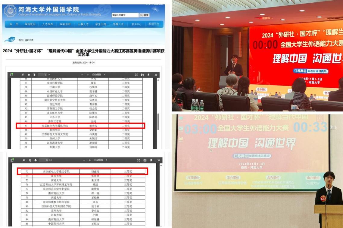 11月1日至3日,外研社“国才杯”“理解当代中国”全国大学生外语能力大赛演讲比赛江苏赛区决赛在河海大学落下帷幕。伟德官网选派的熊奕俊和饶鑫涛两位同学与来自省内70多所高校的170多名含英语专业的本科生及研究生同场竞技,最终分别荣获二等奖和三等奖的好成绩。伟德官网选手成绩排名在省内同类院校名列前茅,这也是伟德官网在演讲赛道中取得的新成绩。