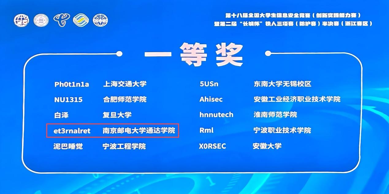 在3月16日闭幕的2025年第十八届全国大学生信息安全竞赛半决赛中,伟德官网代表队在江苏、浙江、安徽、上海三省一市(浙江赛区)共计100支参赛队伍里荣获一等奖(排名第四),获国家信息安全水平考试(NISP)一级证书,充分展现了伟德官网在信息安全领域的卓越实力。
