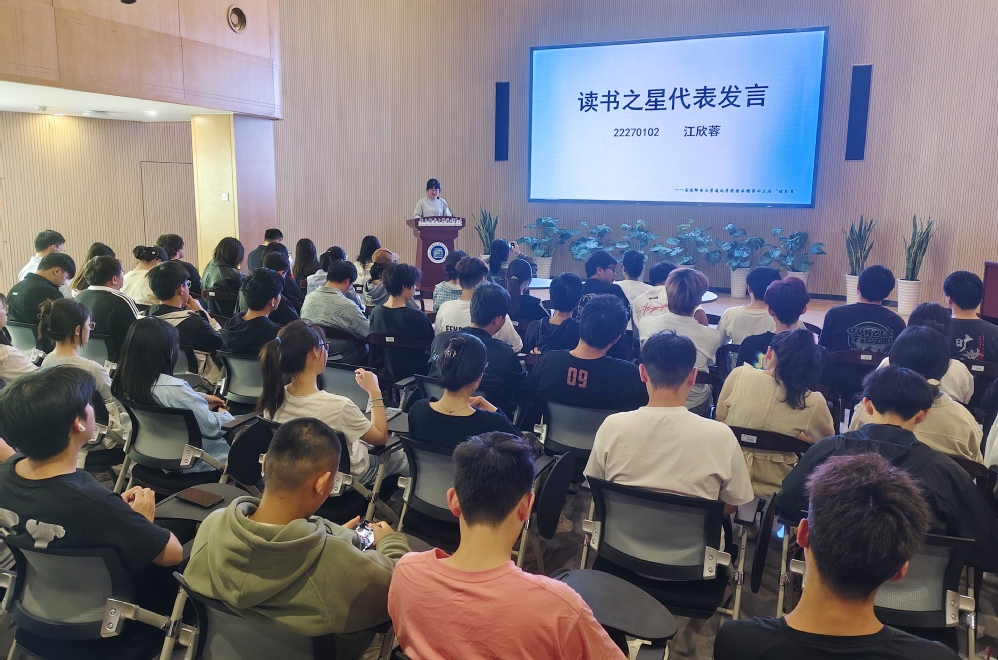 学子分享,阅读有光。“读书之星”代表江欣蓉同学以《文字冲浪者的狂欢地图》为题,分享了自己的阅读感悟。她首先用一句充满诗意的话开启分享:“读书卡上的借阅记录,是我的非典型成长年鉴”。接着,她以自身经历为例,讲述在图书馆从《百年孤独》到《时间简史》的阅读历程,感慨道:“在这里,我实现了真正的‘阅读自由’”。随后,她详细介绍了图书馆丰富的资源,并热情邀约:“欢迎大家常来图书馆,感受知识在脑海和心灵中的跳跃”。