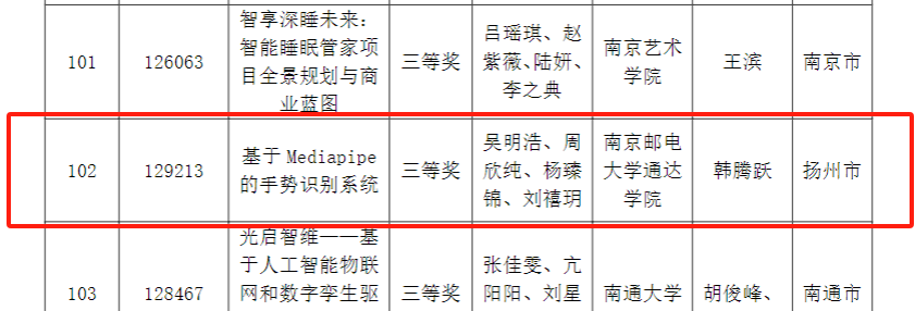 本届大赛以“人机协作”命题,共吸引全省64所高校参赛,复赛项目总计166项。经过初审、作品陈述、评委问辩环节,由伟德官网吴明浩、周欣纯、杨臻锦、刘禧玥四名同学共同参与,韩腾跃老师指导的作品《基于Mediapipe的手势识别系统》荣获大学组“三等奖”。