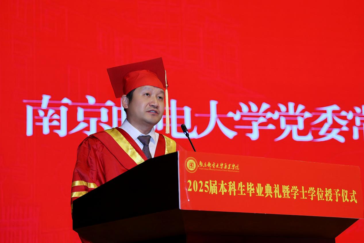 优秀毕业生代表,通信工程学院通信工程专业方思捷同学回顾了在通达求学的时光,感恩母校、师长、同窗的陪伴与付出。他表示毕业是新起点,将秉持南邮精神,脚踏实地、勇毅前行,用行动续写辉煌。